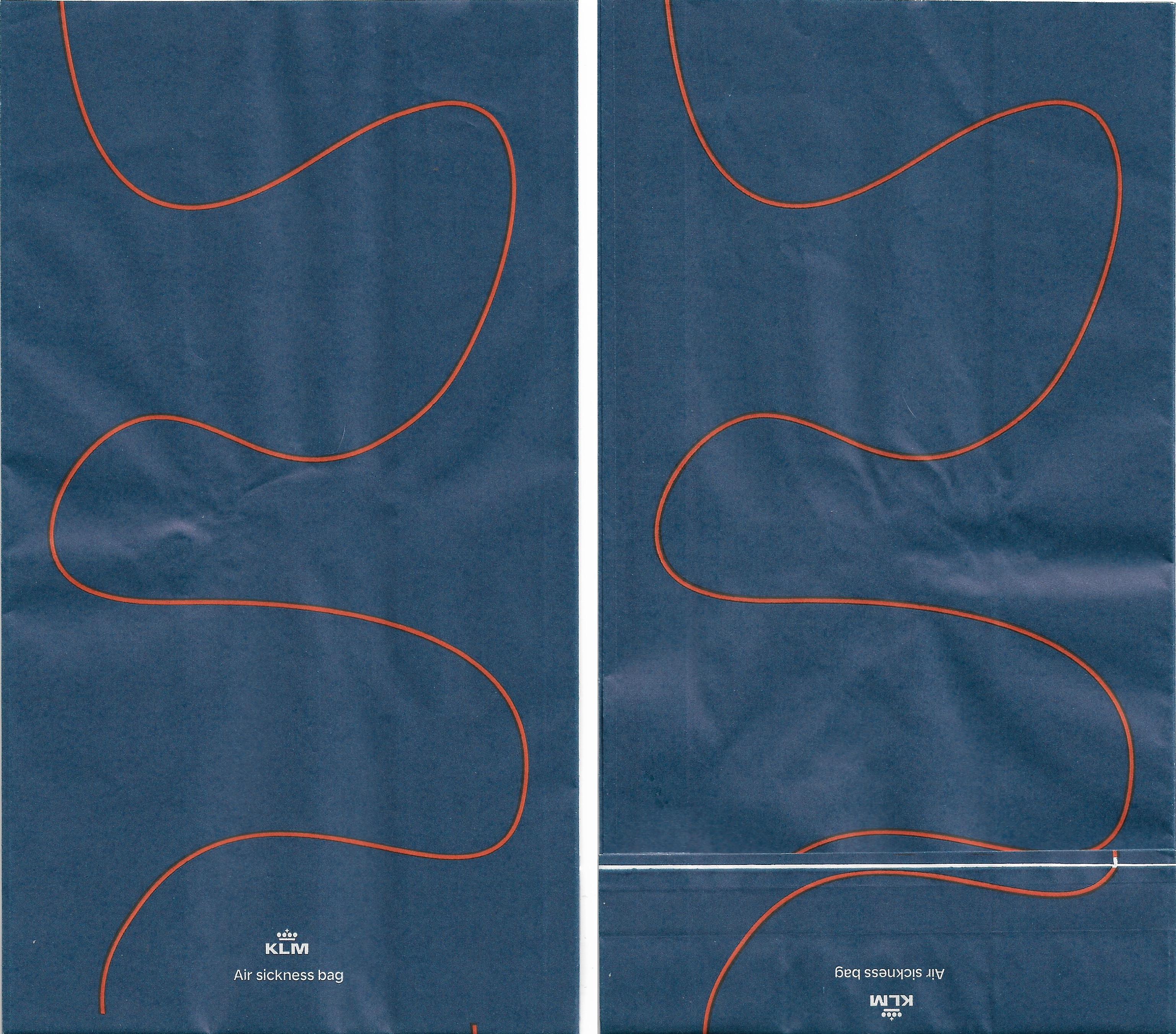 Design: Dark blue base with an orange winding line, KLM logo and text: Air sickness bag